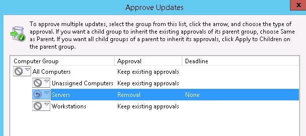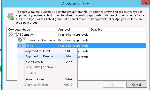 Then select the WSUS Target group you need and choose Approved for Removal in the drop-down list.