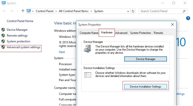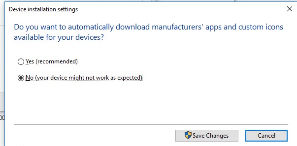 - In the Device Installation Settings window, change the value to “No (your device might not work as expected)” in the dialog “Do you want to automatically download manufacturers’ apps and custom icons available for your device?”;