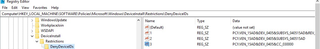 Also, you can enable this policy through the registry. To do this, run the registry editor (regedit.exe) and go to the registry key HKLM\SOFTWARE\Policies\Microsoft\Windows\DeviceInstall\Restrictions\DenyDeviceIDs. In this section, create string (REG_SZ) parameters with the names in order, starting with 1, and the hardware ID value in each parameter.