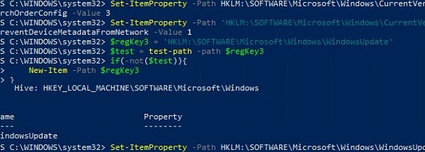 Set-ItemProperty -Path $regKey3 -Name ExcludeWUDriversInQualityUpdate -Value 1