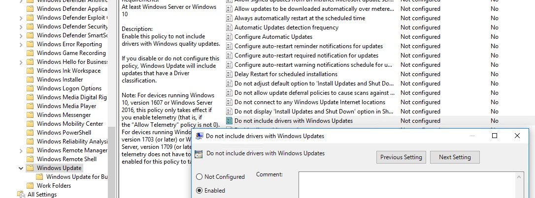 - Go to the section Computer Configuration -> Administrative Templates -> Windows Components -> Windows Update, find and enable the policy named “Do not include drivers with Windows Update”On Windows 11 and Windows Server 2022, this GPO option is located under Computer Configuration -> Administrative Templates -> Windows Components -> Windows Update -> Manage Updates offered from Windows Update.