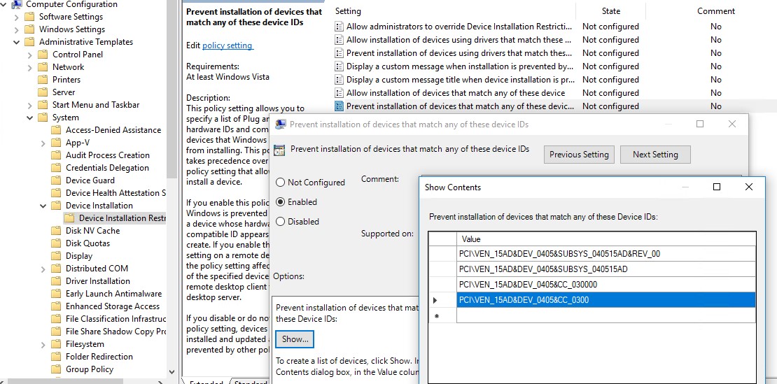 gpedit.mscfor standalone computer) go to the section Computer Configuration -> Administrative Templates -> System -> Device Installation -> Device Installation Restrictions. Enable the policy “Prevent installation of devices that match any of these device IDs”; - Click the “Show” button in the policy settings and copy the graphic card IDs you received earlier into the table of values;