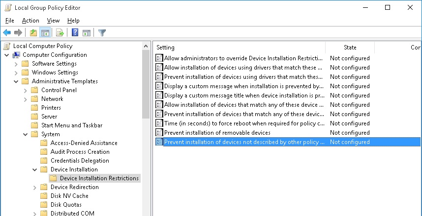 - In the Local Group Policy Editor, go to Computer Configuration -> Administrative Templates -> System ->Device Installation ->Device Installation Restrictions;