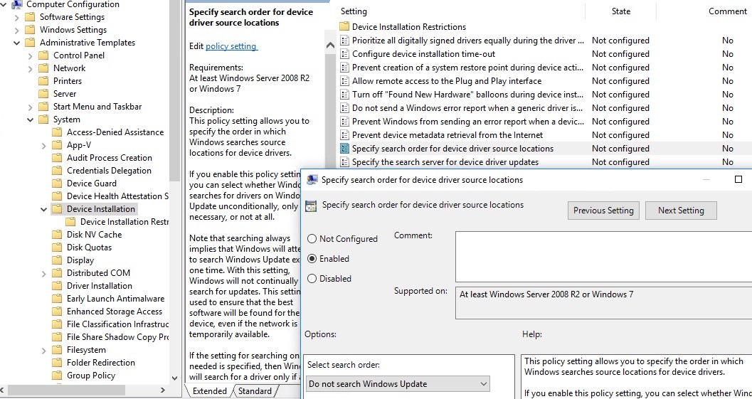 - Then enable the policy “Specify search order for device driver source locations”. This policy is located under the GPO section Computer Configuration -> Administrative Templates -> System -> Device Installation. Change the policy setting to “Do not search Windows Update”. This policy allows you to exclude the search for driver updates on Windows Update sites (when installing a driver for any Windows device, it tries to find a more suitable driver through the Windows Update service);