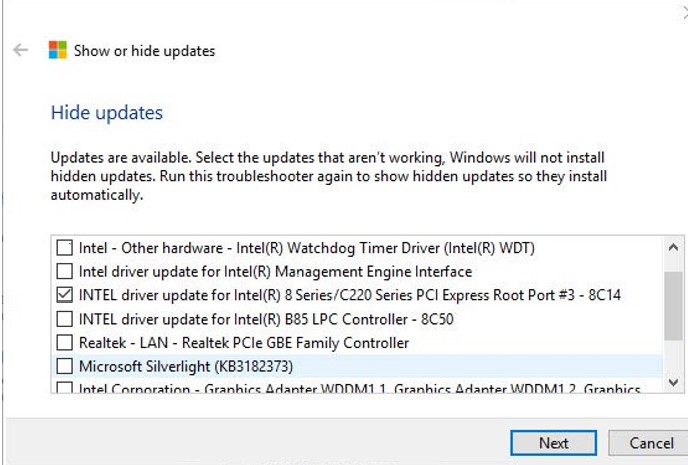 wushowhide.diagcabtool and select the option “Hide Updates“; - In the list of the available Windows updates and drivers, check the drivers for which you want to disable the auto-update and click the Next button;