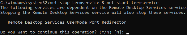 net stop termservice & net start termservice - To connect to this Windows host via Remote Desktop, you have to specify the new RDP connection port in your mstsc.exe client using the colon as follows: