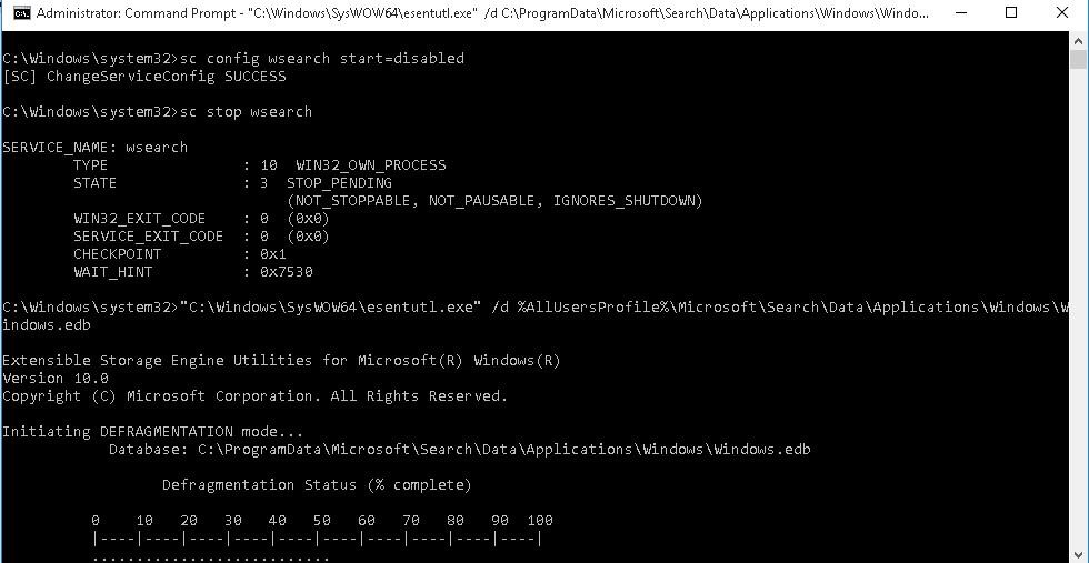 I had a “cant find file” error when i ran this: “esentutl.exe /d %AllUsersProfile%\Microsoft\Search\Data\Applications\Windows\Windows.edb”