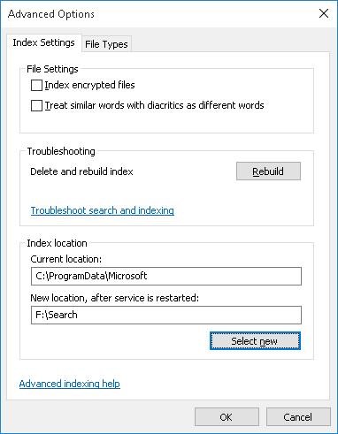 To change the index file location, go to Control Panel -> Indexing Options -> Advanced -> Index location-> New Location, specify the path to the new location of Windows.edb file and click Ok.