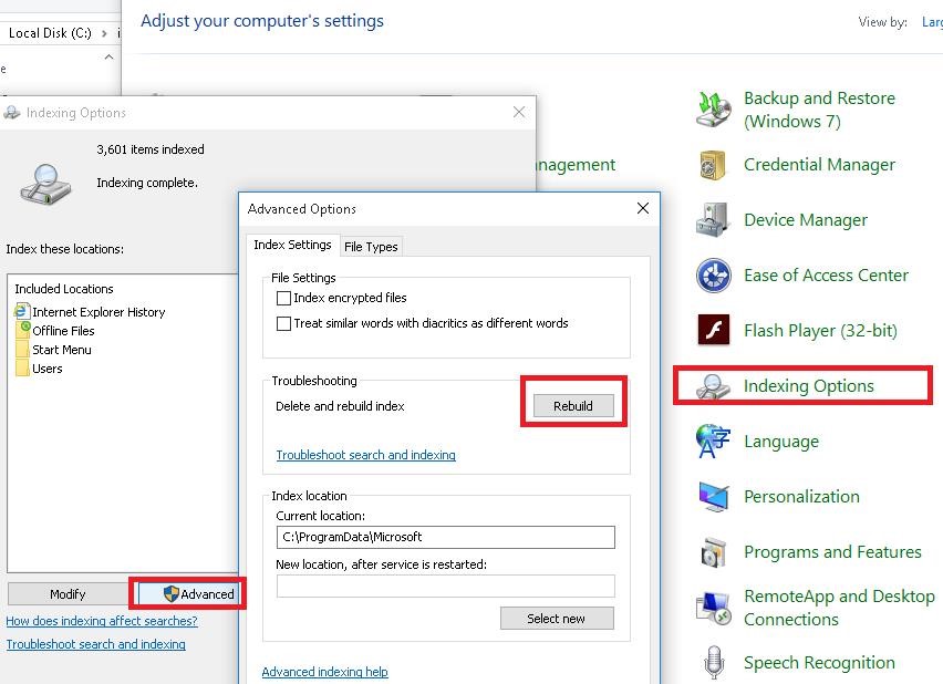 Thank you so much for the informative article. I’ve been constantly running out of disk space on my laptop’s 250GB drive, when I noticed that my windows.edb file was close to 50GB in size. I did a Delete and Rebuild of my index and the new index shrank down to 340MB, giving me back close to 50GB of disk space.