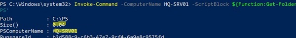 Invoke-Command -ComputerName hq-srv01 -ScriptBlock ${Function:Get-FolderSize} –ArgumentList 'C:\PS'