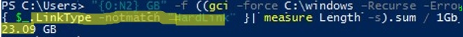 "{0:N2} GB" -f ((gci –force C:\windows –Recurse -ErrorAction SilentlyContinue | Where-Object { $_.LinkType -notmatch "HardLink" }| measure Length -s).sum / 1Gb)