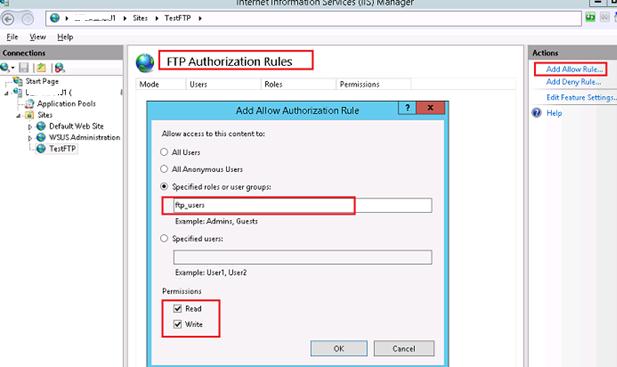 Return to the IIS console and create a new rule (Add AllowRules) in FTP Authorization Rules section of the site. Specify that ftp_users group must have the read and write permisions.