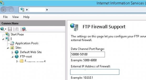 - Open the FTP Firewall Support section in FTP site settings and in the Data Channel Port Range field specify the port range that you want to use for FTP connections. For example – 50000-50100;