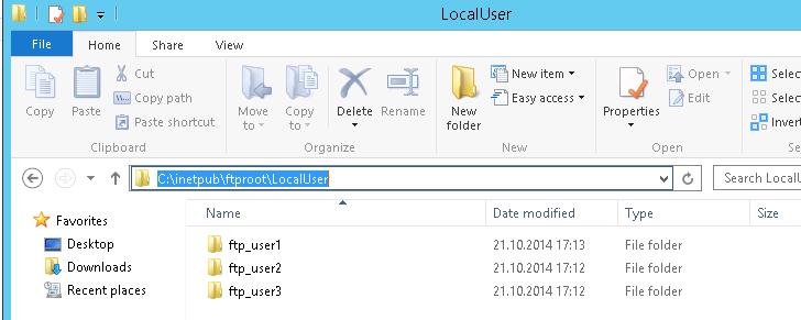 Create a directory with the name LocalUser (the name must be the same, it’s important!!!) in the folder C:\inetpub\ftproot. Then make three directories under with the names ftp_user1, ftp_user2, ftp_user3 in the folder C:\inetpub\ftproot\LocalUser.
