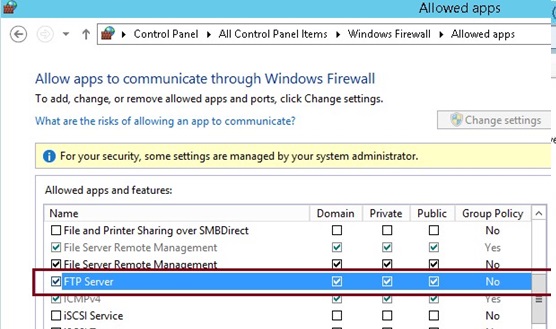 - Make sure that the list of applications that are allowed access through the firewall contains permissions for the FTP Server role.