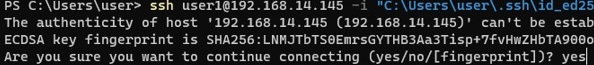 When connecting for the first time, you need to add the fingerprint of the SSH server key to the trusted list. Type yes -> Enter.