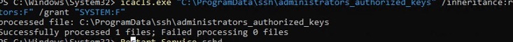 icacls.exe "C:\ProgramData\ssh\administrators_authorized_keys" /inheritance:r /grant "Administrators:F" /grant "SYSTEM:F" - or using the Get-Acl and Set-Acl PowerShell cmdlets: