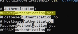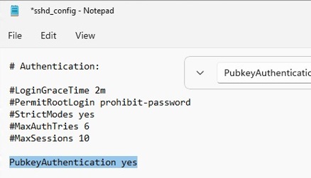 In this example, the PubkeyAuthentication line is commented out, which means that this authentication method is disabled. Open the sshd_config file with notepad and uncomment the line: