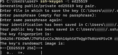 Generating public/private ed25519 key pair. Enter file in which to save the key (C:\Users\myuser/.ssh/id_ed25519): Enter passphrase (empty for no passphrase): Enter same passphrase again: Your identification has been saved in C:\Users\myuser/.ssh/id_ed25519. Your public key has been saved in C:\Users\myuser/.ssh/id_ed25519.pub. The key fingerprint is: SHA256:xxxxxxxx myuser@computername The key's randomart image is: +--[ED25519 256]--+ +----[SHA256]-----+
