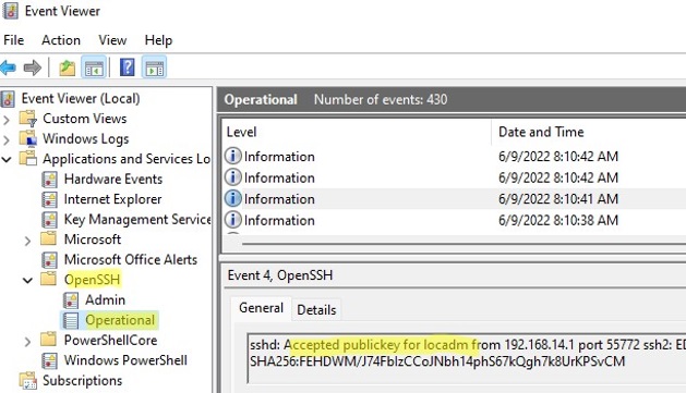 EventID 4 sshd: Accepted publickey for locadm from 192.168.15.20 port 55772 ssh2: ED25519 SHA256:xxxxxxx
