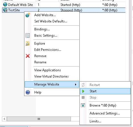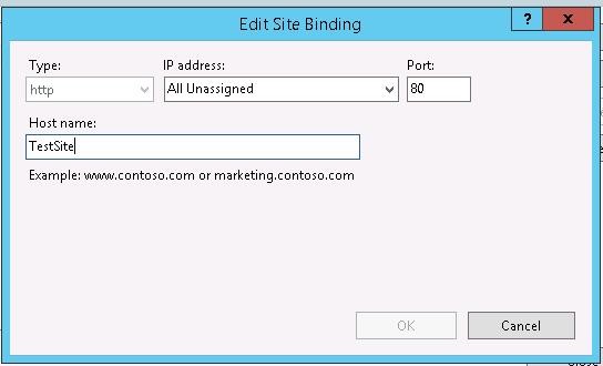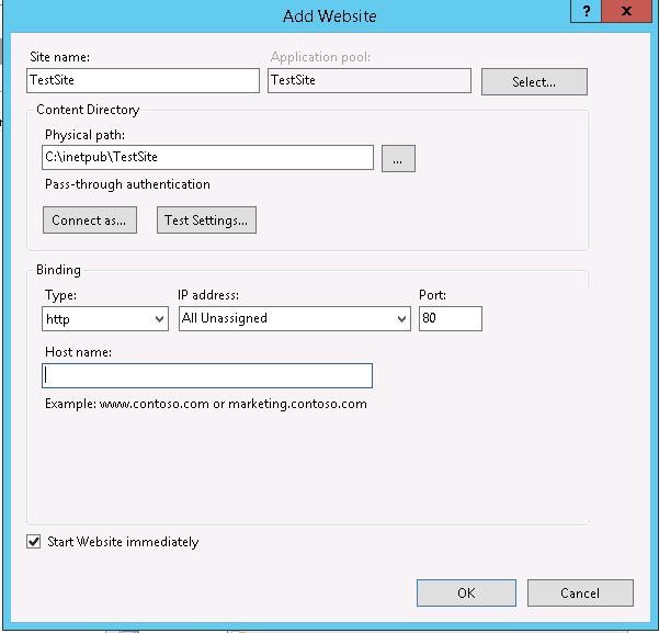 In the IIS Manager, create another website (Add Website) with the name TestSite, which files will be located in c:\inetpub\TestSite (do not specify the hostname yet).