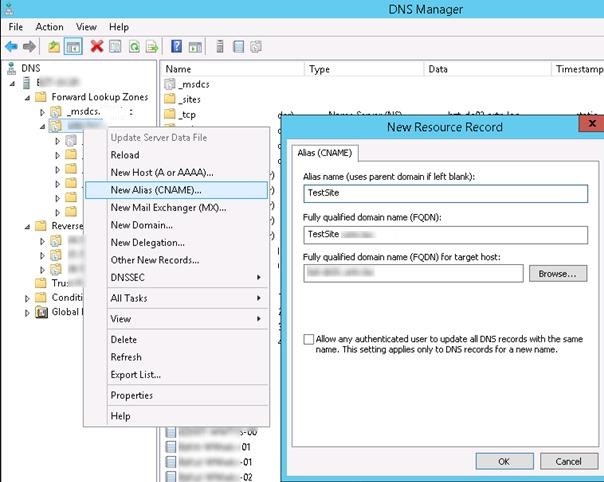 Now you need to create an A record for the new site on the DNS server (we will additionally create a PTR record in the reverse zone with the –CreatePtr option):