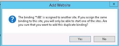 Add Website The binding '*:80:' is assigned to another site. If you assign the same binding to this site, you will only be able to start one of the sites. Are you sure that you want to add this duplicate binding?