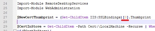 $NewCertThumbprint = (Get-ChildItem IIS:SSLBindings\0.0.0.0!443)[0].Thumbprintand