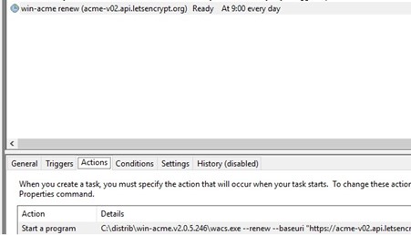 Windows ACME Simple creates a new job in the Windows Task Scheduler (win-acme-renew (acme-v02.api.letsencrypt.org)) to automatically renew the certificate. The task starts every day, and the renewal of the certificate is performed after 60 days. This task runs the command: