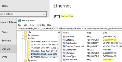 In order to find the network you need, look through all the registry keys and find the key that contains the parameter ProfileName with the network you need from the Network and Sharing Center (or the Name value from the Get-NetConnectionProfile command). In our case, the computer is connected to Network 4.