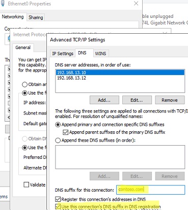 Also, in some cases, it can help to force set the DNS suffix of your domain in the network adapter settings (network adapter -> TCP / IPv4 -> Advanced -> DNS, specify your domain name in the “DNS suffix for this connection”, and check the option “Use the suffix of this connection in the DNS registration”.
