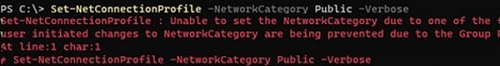 Set-NetConnectionProfile : Unable to set the NetworkCategory due to one of the following possible reasons: not running PowerShell elevated; the NetworkCategory cannot be changed from 'DomainAuthenticated'; user initiated changes to NetworkCategory are being prevented due to the Group Policy setting 'Network List Manager Policies'.