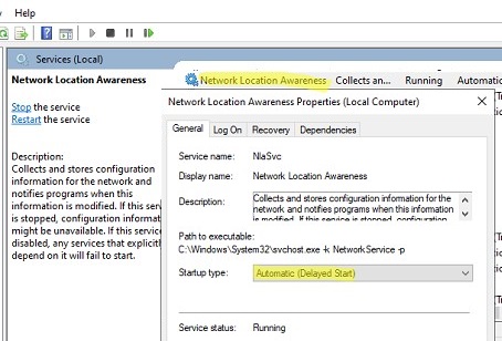 To fix this problem on Windows Server, you need to configure the delayed start type for the Network Location Awareness service. To do this, select the Automatic (Delayed Start) option in the service properties and save the changes.