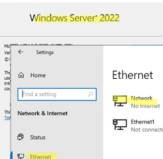 In Windows Server 2022/2019, the Properties option is missing from the Status tab. Therefore, select the Ethernet section in the Network and Internet section (or the Wi-Fi section if wireless networking is enabled in Windows Server). Select your network connection.