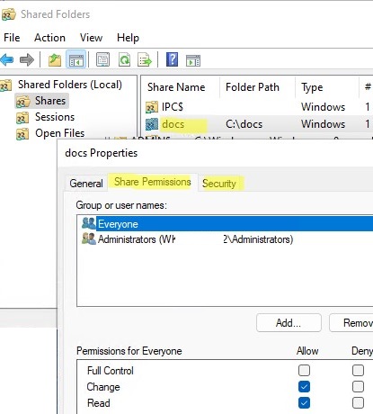 New-SmbSharePowerShell cmdlet. - In addition, in this console, you can view or change the current access permissions to the shared folder. A network folder has two access lists: Share Permissions and Security (NTFS file system permissions). If you grant access to Everyone at the share level, then effective access permissions to files and folders will be determined by NTFS ACL on the Security tab.