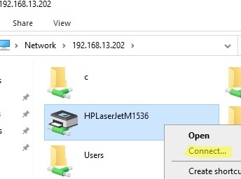 - Right-click the printer you want to install and select the Connect option. Windows will download and install the print driver from the remote computer and connect the shared network printer;
