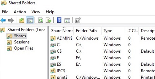 - It contains a list shared folder on your computer. It also displays the administrative shares (Admin$, C$, IPC$, etc.), and the number of remote connections to each share (Client Connections); You can see the list of files opened on your computer over the network by remote users in the “Open Files” section of the console.
