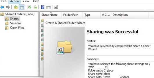- To create a new shared folder on a Windows computer, select Action -> New Shared Folder;
