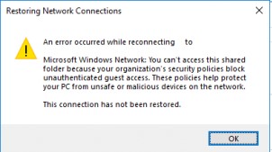 Restoring Network Connections An error occurs when you try to open a network folder: An error occurred while reconnecting Y: to \\nas1\share Microsoft Windows Network: You can’t access this shared folder because your organization’s security policies block unauthenticated guest access. These policies help protect your PC from unsafe or malicious devices on the network.