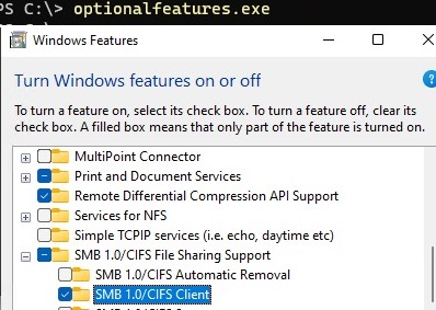 You can also enable/disable additional features in Windows 10 and 11 from the optionalfeatures.exe. Expand SMB 1.0/CIFS File Sharing Support and enable the SMB 1.0/CIFS Client.