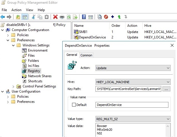 gpmc.msc), create a new GPO (disableSMBv1) and link it to the OU containing the computers on which you want to disable SMB1; - Switch to the policy editing mode. Expand the GPO section Computer Configuration -> Preferences -> Windows Settings -> Registry;