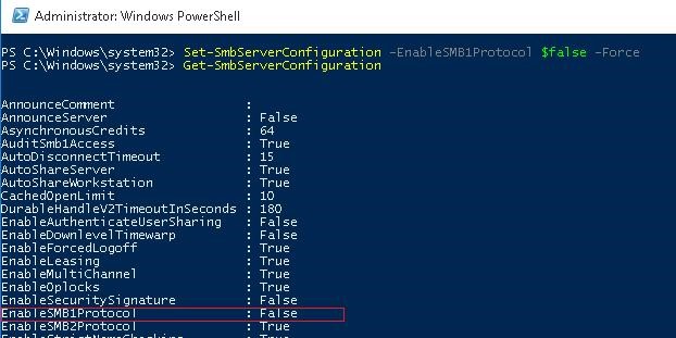 Set-SmbServerConfiguration -EnableSMB1Protocol $false -Force