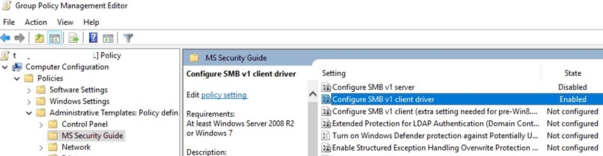 SecGuide.adml and SecGuide.admx files) that have separate options for disabling the SMB server and client:- Configure SMB v1 server;