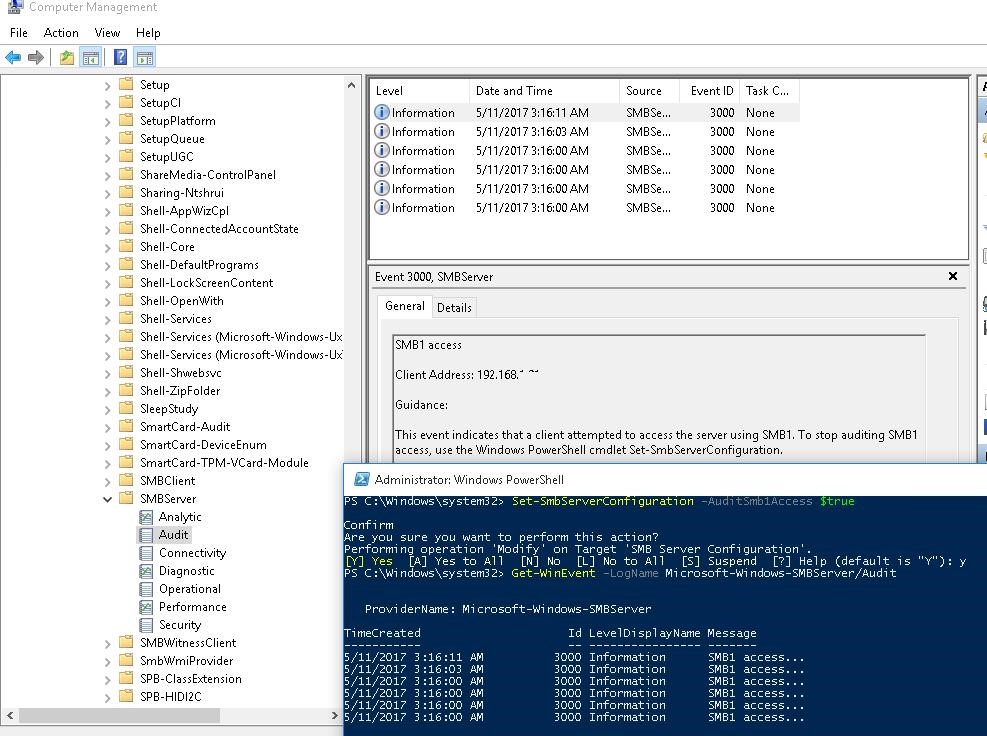 SMB1 access Client Address: 192.168.1.10 Guidance: This event indicates that a client attempted to access the server using SMB1. To stop auditing SMB1 access, use the Windows PowerShell cmdlet Set-SmbServerConfiguration.