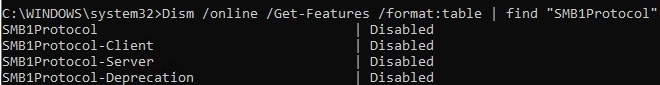 In Windows 10, you can check the status of the SMBv1 protocol components with the DISM command: