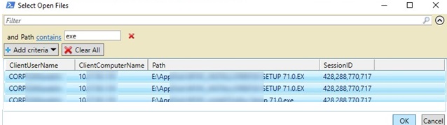 You can display a list of open files by pattern. For example, to list all exe files opened from the shared folder: