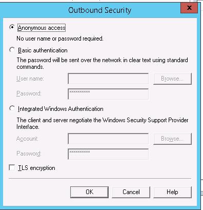 Then click Outbound Security. Here you specify the way of authentication on the external mail server to which your SMTP server will send (relay) all email messages. For example, if all emails will be forward to Gmail mail server and then sent to the recipients, you need to check the Basic authentication and specify your Gmail mailbox credentials (you must allow to send email via Gmail SMTP in the Google account settings).