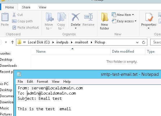 Copy the file smtp-test-email.txt to the C:\inetpub\mailroot\Pickup folder. The Windows SMTP server monitors new files appearing in this folder, and if a file is found it will read it contents and try to send an email with the given subject and body to the recipient specified in the To: line.