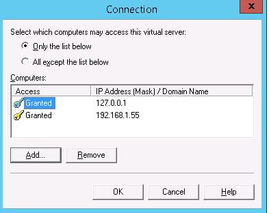 Go back to the Access tab and click the Connection button. Here you can specify the IP addresses of devices that are allowed to send emails through your SMTP relay. To do it, check the Only the list below and specify the list of IP addresses (subnets), don’t forget about yourself (127.0.0.1).