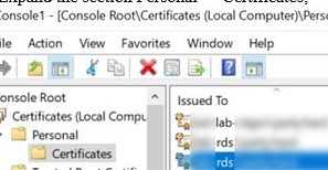 - Find your certificate that is used in your RDS farm, right-click on it, and choose select All Tasks -> Export;